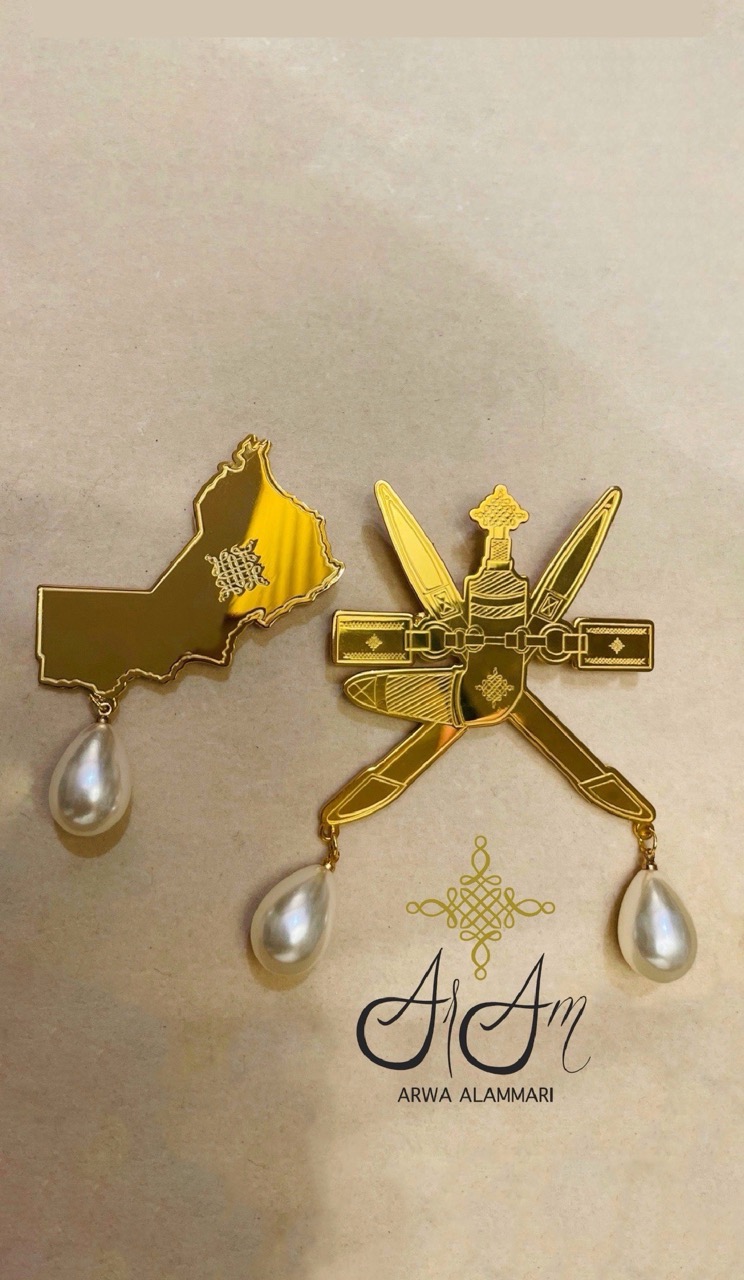 A 21K gold-plated brooch inspired by the Oman map, finished with elegant drop pearls.